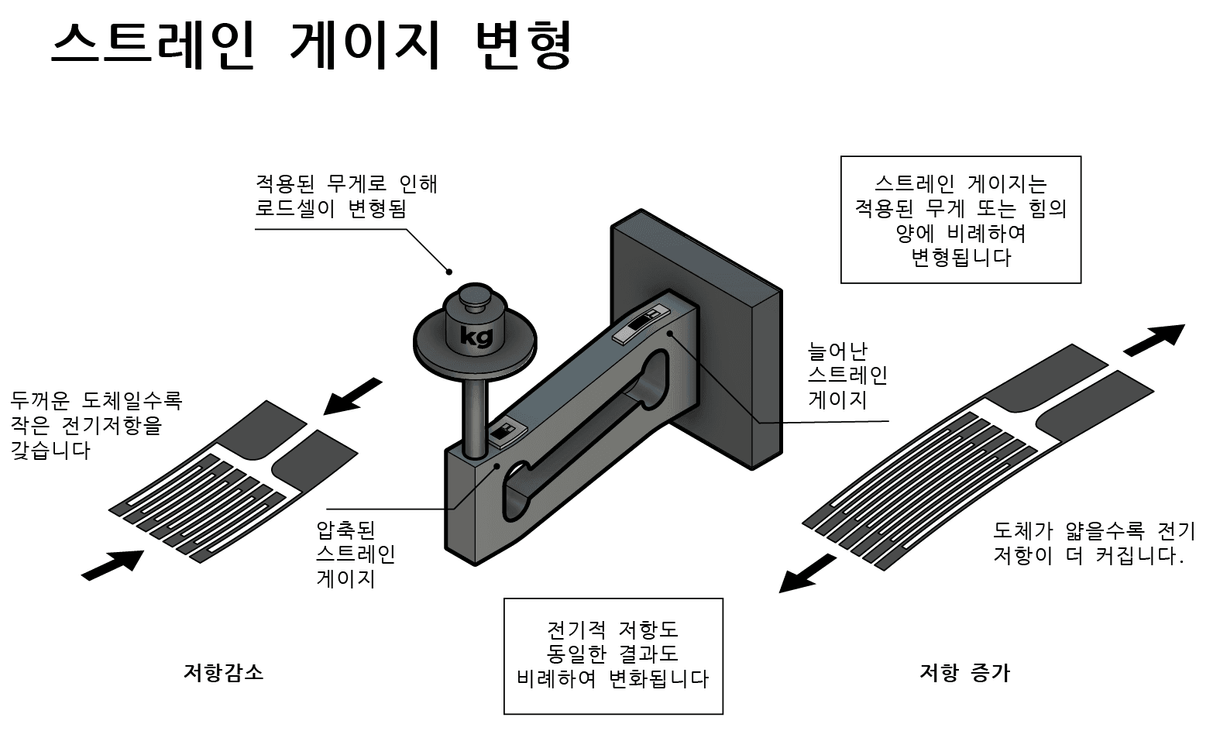 전기적 회로는 본체에 단단히 결합되어 로드셀에 내장됩니다. 회로는 본체의 변형을 감지하도록 설계된 회로의 특수장치인 스트레인게이지(Strain-gauge)를 포함합니다.